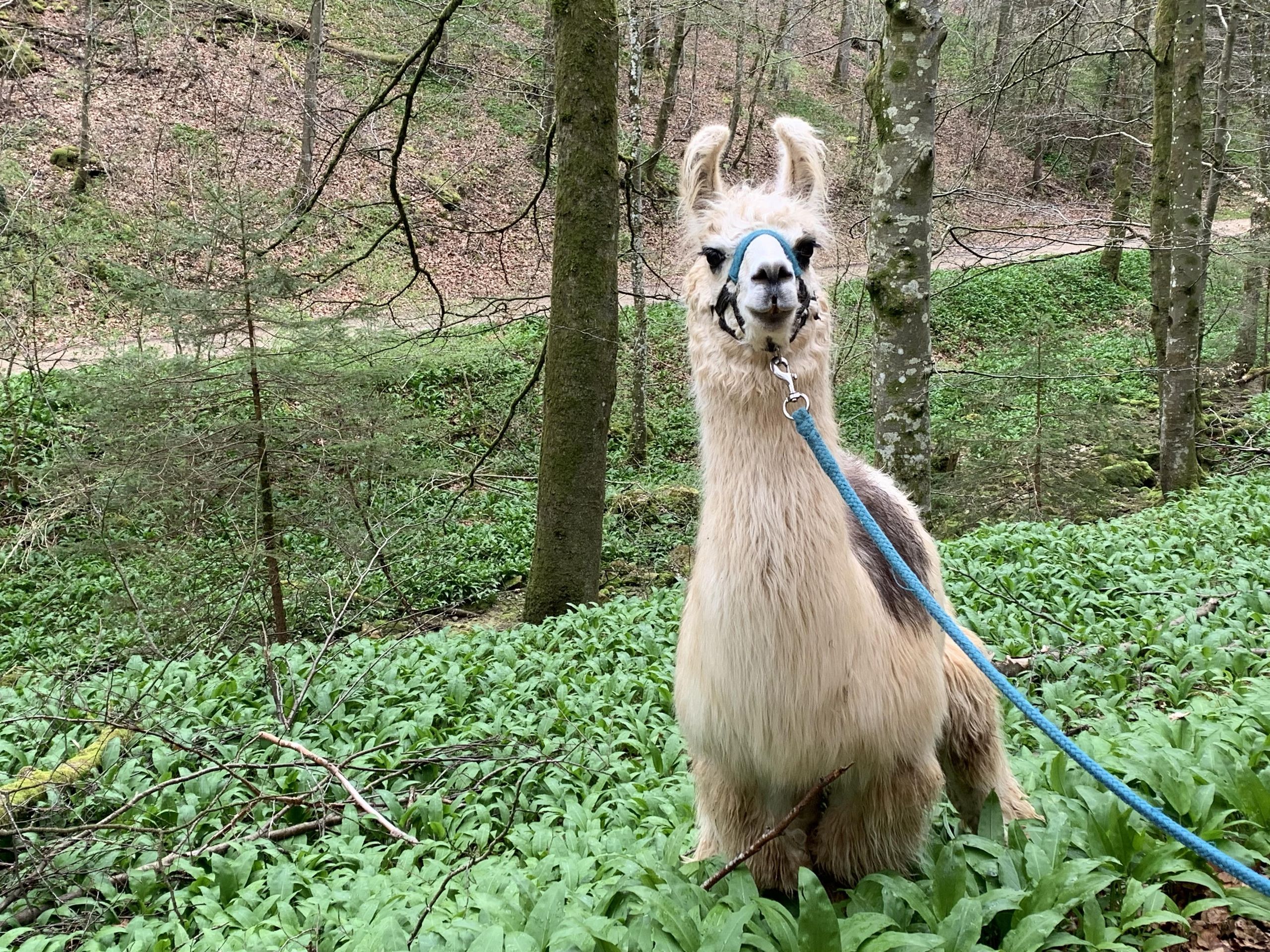 Ab März bedeckt ein Meer aus grünen Blättern den humusreichen Waldboden unter den noch kahlen Baumkronen: Hier wächst Bärlauch und verströmt seinen unwiderstehlichen Duft. Wir wandern mit unseren Lamas und Alpakas zu einem dieser Bärlauchfelder und ernten mit der gebotenen Vorsicht einige Blätter.