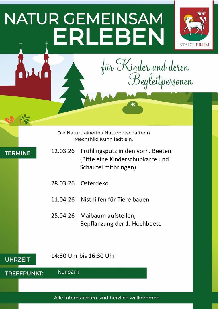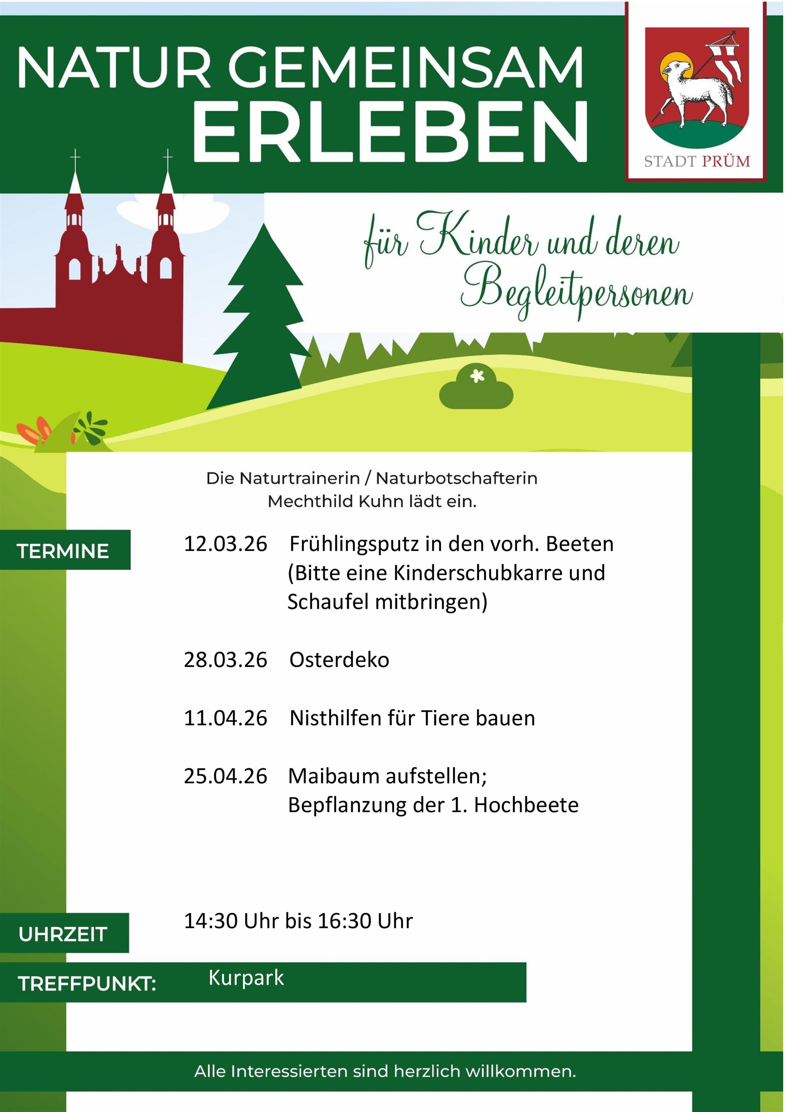 Unter dem Motto Natur gemeinsam erleben lädt die Naturtrainerin und -botschafterin Mechthild Kuhn Kinder und deren Begleitpersonen in den Kurpark ein. Motto des Tages: Maibaum aufstellen; Bepflanzung der 1. Hochbeete.