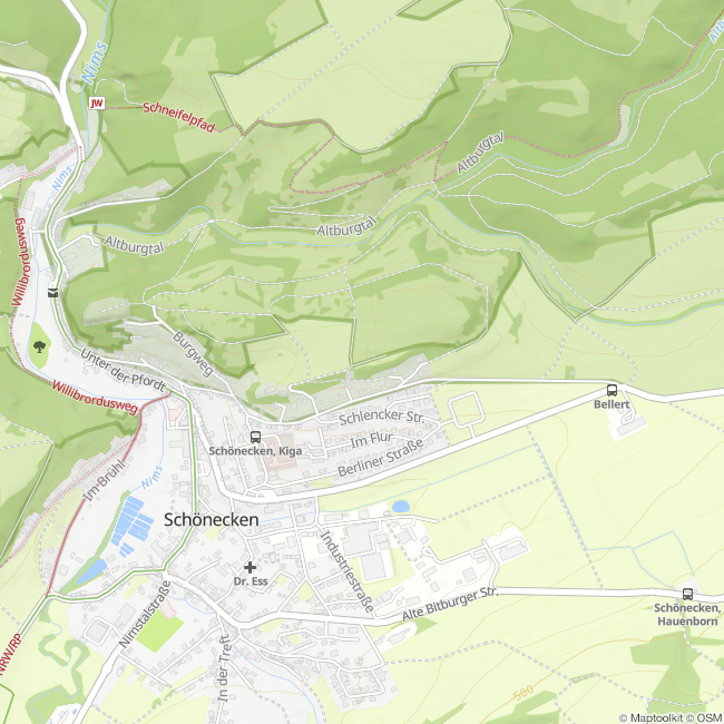 Unsere zweistündige Schlemmerwanderung beginnt und endet direkt unterhalb der Burgruine von Schönecken. Nach einer kurzweiligen Einführung, bei der ihr die Lamas kennen lernt, starten wir zu unserer Tour in das Naturschutzgebiet Schönecker Schweiz. Gleich zu Beginn wandern wir hinab in das Tal des Altburgbachs. Streuobstwiesen und die dunklen Silhouetten der Wacholderbüsche begleiten uns. Dann erklimmen wir den Bergrücken "Op Ischt" und lassen unseren Blick bis hin zum Hohen Venn schweifen. Wenig später tauchen wir in den Buchenwald ein und gelangen an eine versteckte Lichtung, in der im Spätsommer der Enzian blüht. Wir folgen dem Schalkenbach auf seinem Weg hinab zur Nims und gelangen nach etwa einer Wanderstunden an die Crêperie "Nice Corner", die direkt am Flussufer liegt.