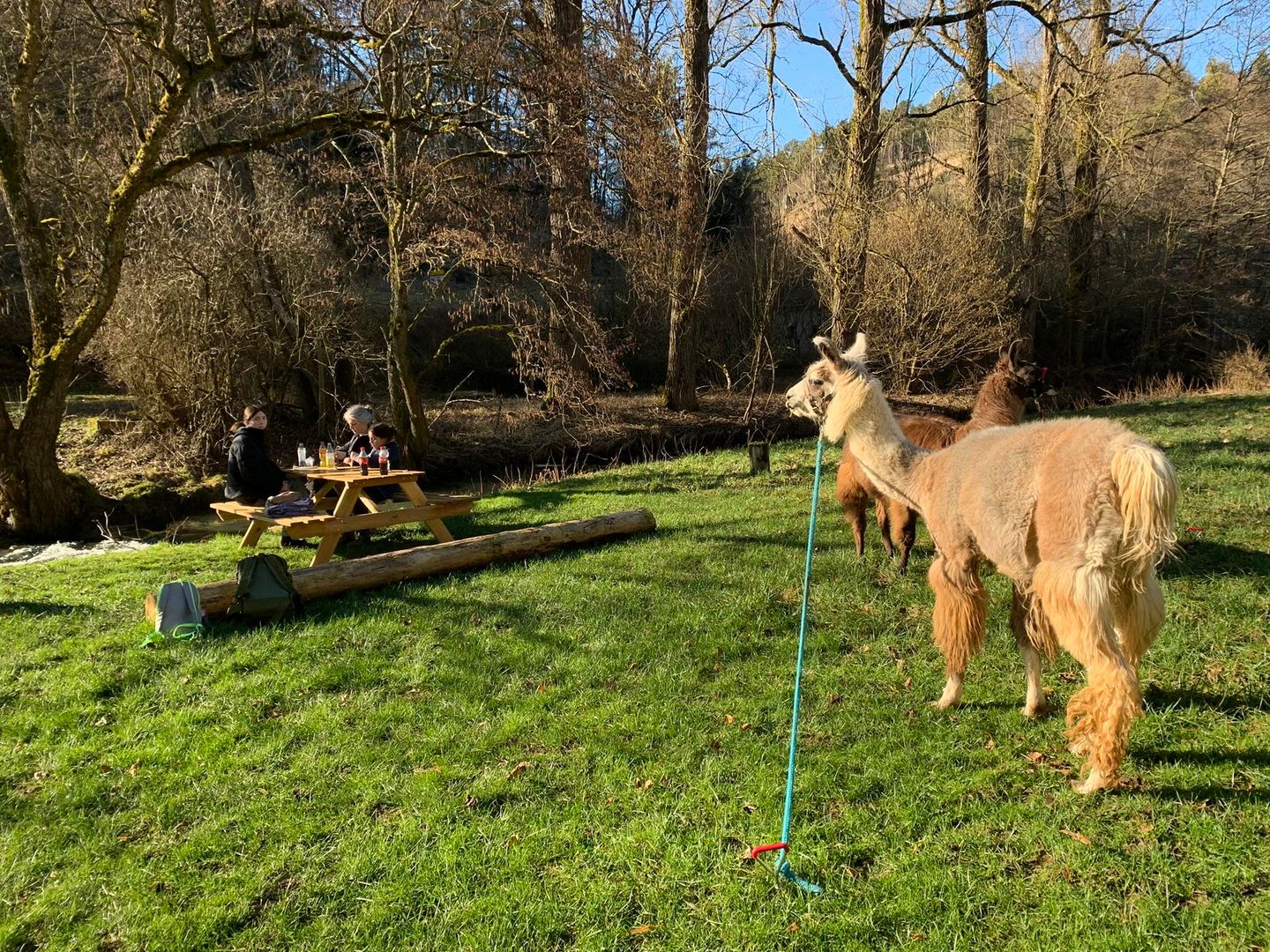 Hier können wir zwischen den leckeren süßen und auch herzhaften Crêpes, frisch gebackenen Waffeln oder gar einer leckeren Bratwurst wählen. Wir sitzen etwa eine halbe Stunde gemütlich beisammen. Unsere Lamas grasen derweil auf der angrenzenden Wiese. Dann geht es nochmals hinauf in die Schönecker Schweiz und zur Burgruine Schönecken. Nach einer weiteren Wanderstunde erreichen wir wieder unseren Stall. Hier verabschieden wir uns von unseren treuen Begleitern, den Lamas.