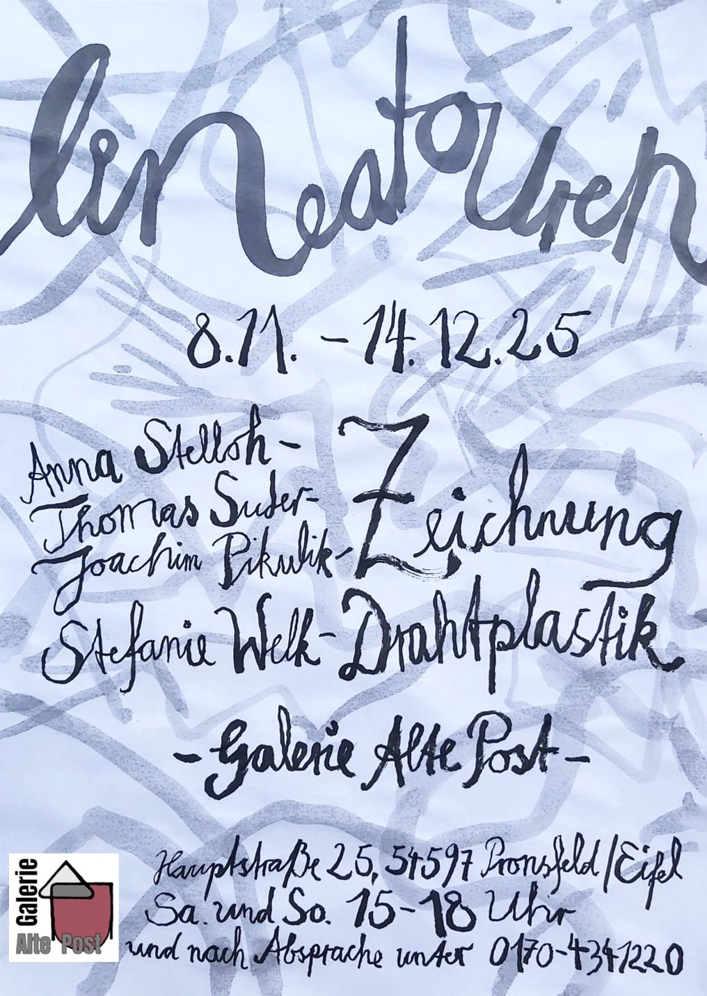 La nouvelle exposition « lineatouren » à l'Alte Post à Pronsfeld célèbre la ligne dans ses différentes manifestations. Les multiples possibilités de variations se manifestent dans les dessins et impressions d'Anna Stelloh (Nettersheim), Thomas Suder (Düsseldorf) et Joachim Pikulik (Pronsfeld).