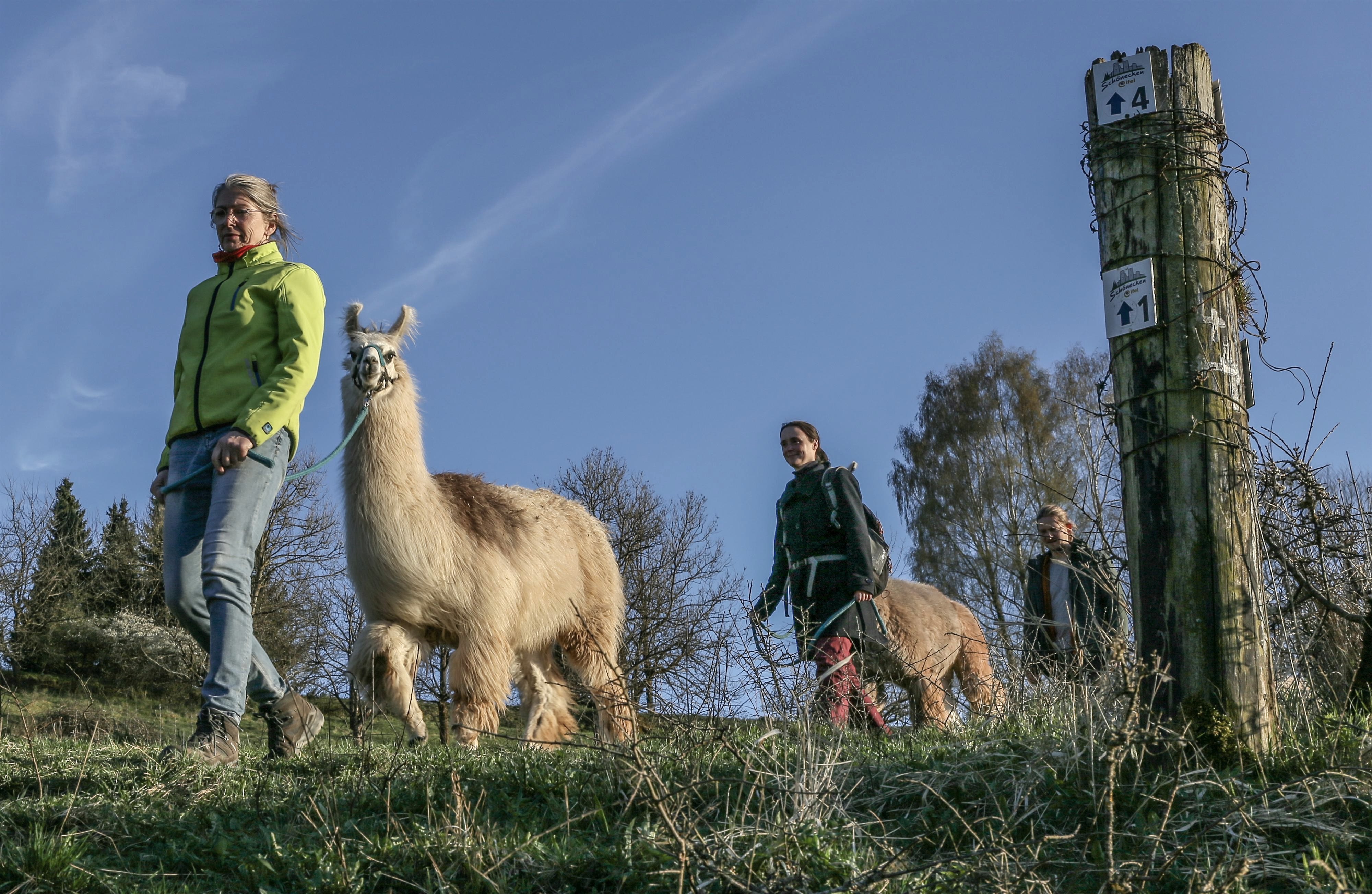 Notre événement unique commence et se termine directement en dessous de la ruine du château de Schönecken, sur le pâturage des nomades de l'Eifel. Après une rapide introduction, où vous connaîtrez les lamas et apprendrez comment les conduire, nous commencerons ensemble notre randonnée avec notre guide expert.