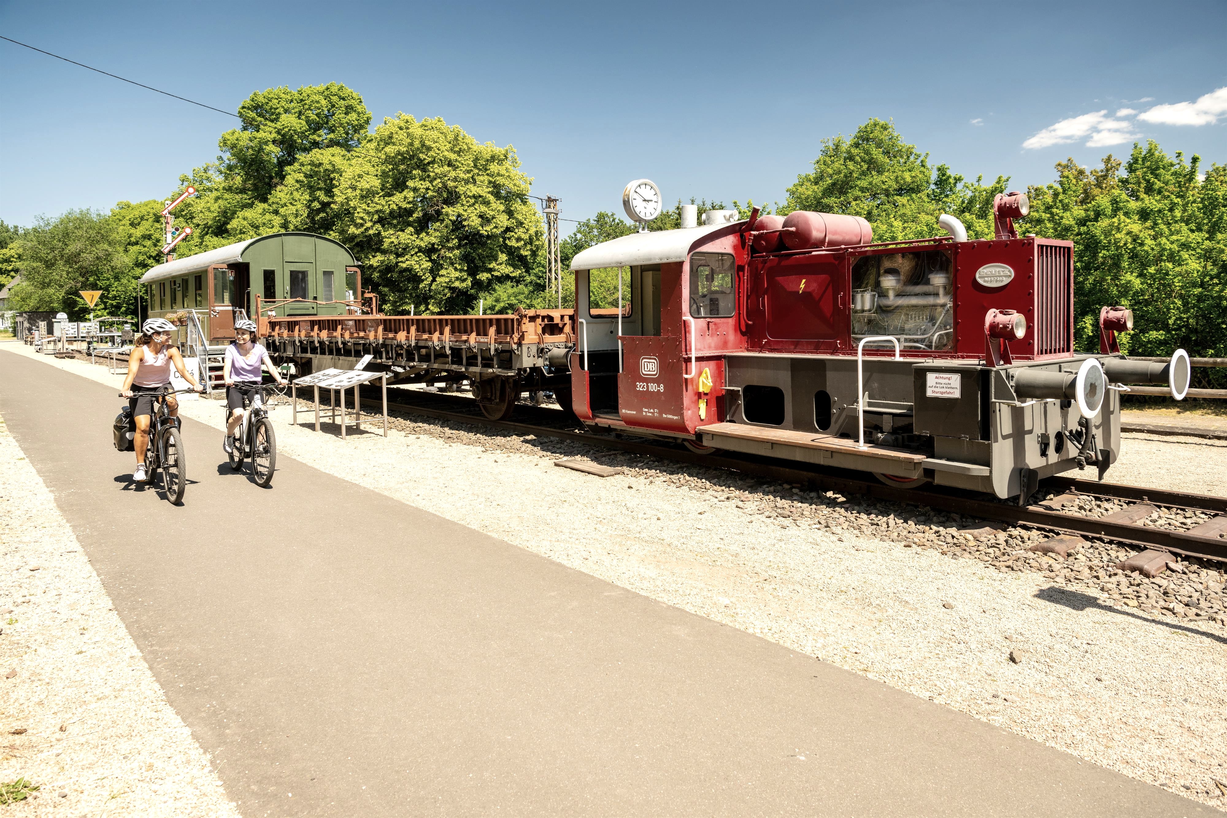 Schon von Weitem weist eine alte Museumslok den Weg zu dem kleinen Eisenbahnmuseum am Radweg in Pronsfeld. Dort wo einst die Züge der Westeifelbahn fuhren, sind auf den alten Bahntrasse heute RadfahrerInnen zwischen Prüm und St. Vith in Belgien unterwegs. Das Museum zeigt anhand von Fotos und Dokumenten an Schautafeln, die Geschichte der Eisenbahn in Pronsfeld seit 1886. Zusehen sind unter anderem eine Kleinlokomotive vom Typ Köf II mit Flachwagen, ein 3. Klasse Personenwagen aus dem Jahr 1940 sowie Bahnschranken, Gleisstücke, Formsignale und diverse bahnhistorische Geräte.
