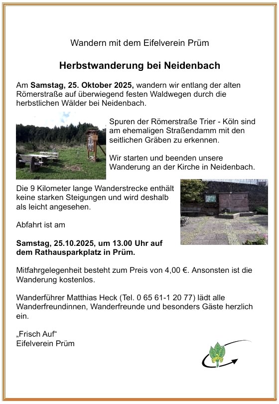 Spuren der Römerstraße Trier - Köln sind am ehemaligen Straßendamm mit den seitlichen Gräben zu erkennen. Start und Ende der Wanderung ist an der Kirche in Neidenbach. Die 9 Kilometer lange Wanderstrecke enthält keine starken Steigungen und wird deshalb als leicht angesehen. Die Wanderung dauert 3 Stunden.