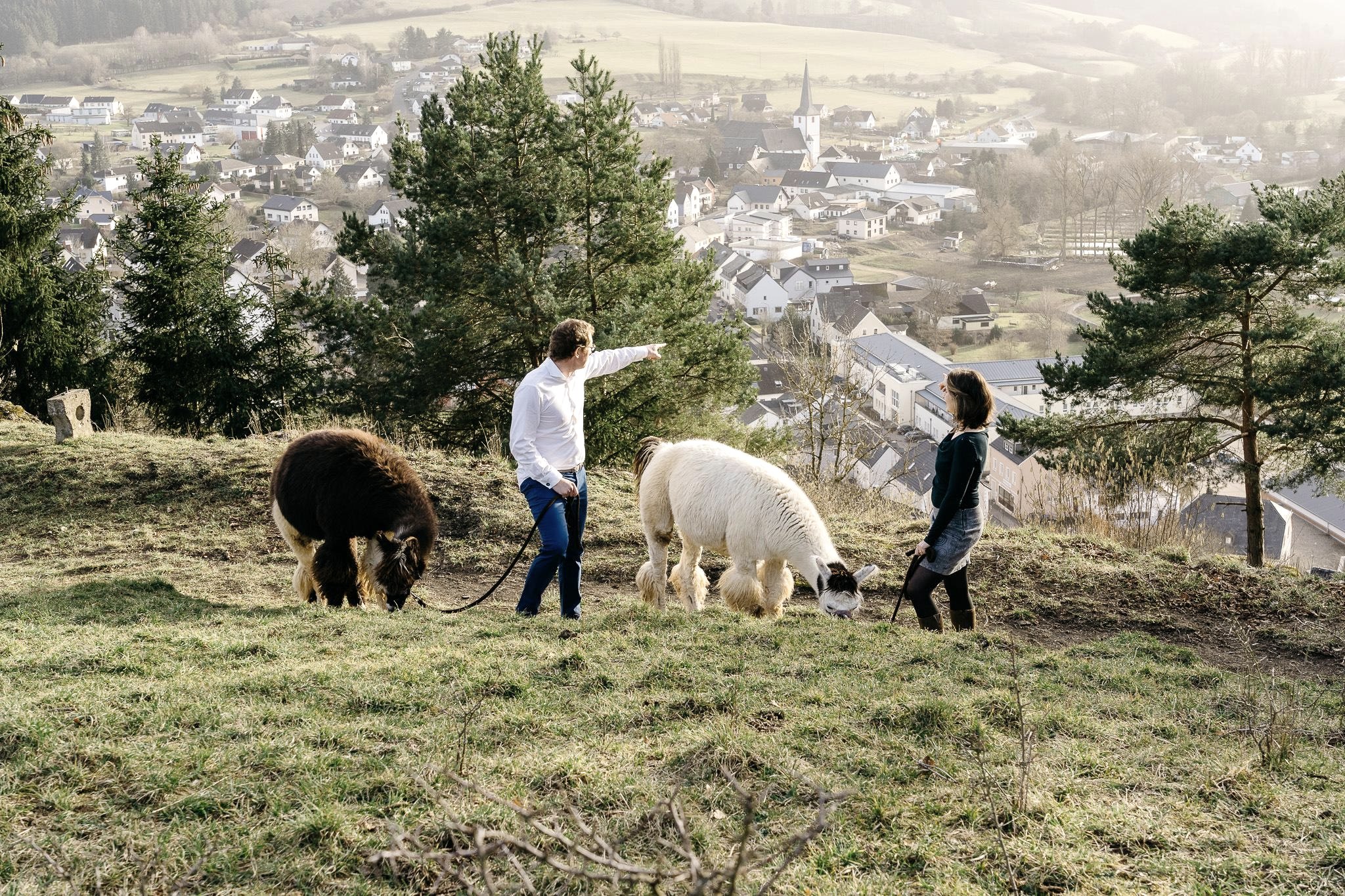 Oberhalb von Schönecken mit Blick auf die Burg liegt unsere Lama-Weide, direkt am Naturschutzgebiet. Hier könnt ihr euer ganz persönliches Rendezvous in Begleitung unseren Lamas verbringen, den definitiv treuherzigsten Wing-Men der Welt. Euer ganz exklusives Lama-Event umfasst eine private, geführte Wanderung mit zwei unserer Lamas durch das Naturschutzgebiet Schönecker Schweiz und dem Besuch der Burgruine Schönecken.