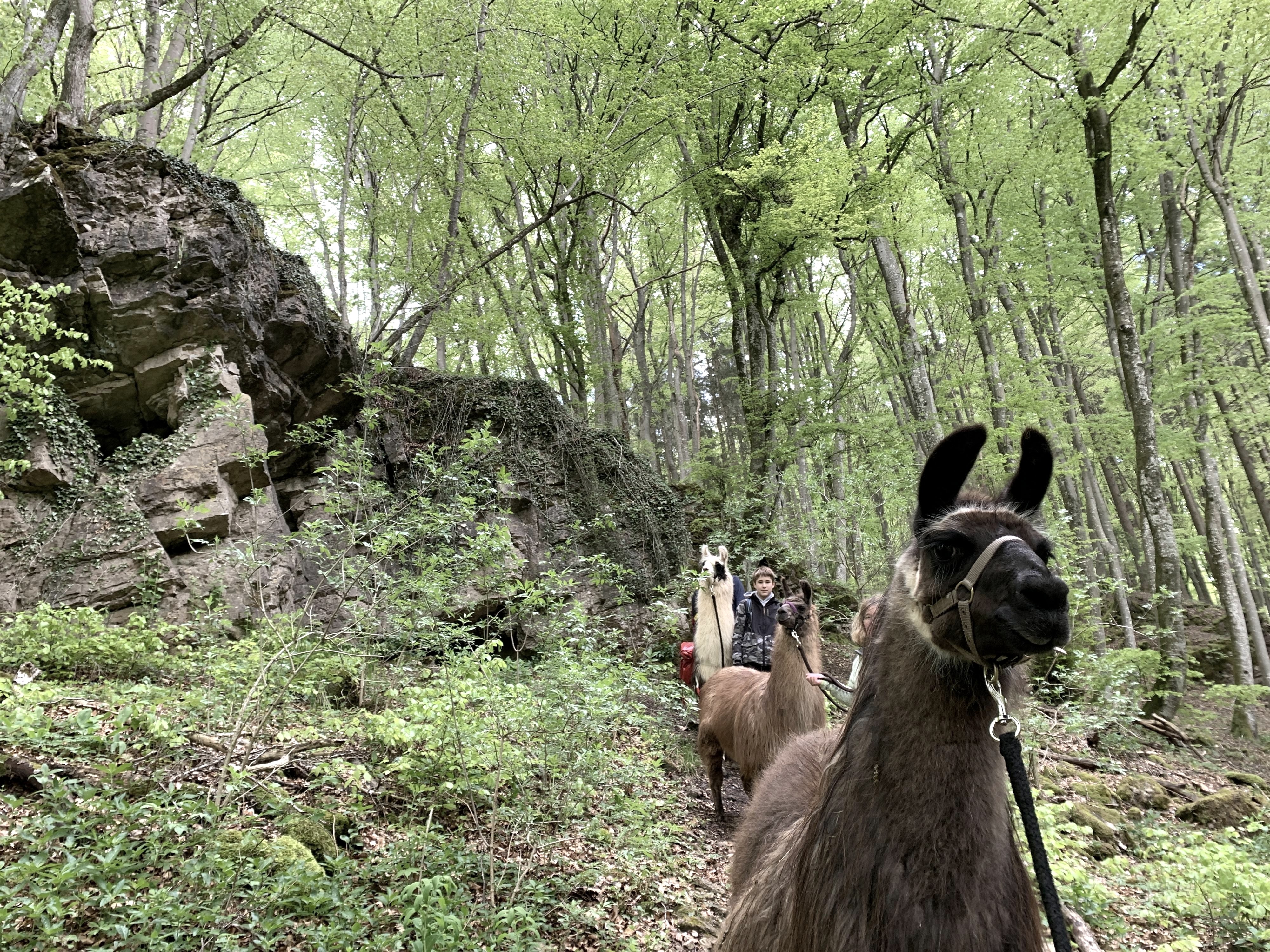 In de buurt van deze magische plaats houden we een langere pauze, voordat we ons weer naar het zuidwesten wenden. Een korte tijd trekken we door de velden van de bergrug "Op Ischt" en duiken dan opnieuw het beukenbos in. Op een steil aflopende rotsuitsteeksel hoog boven het Altburgtal ligt de oeroude Keltische vluchtheuvel. Het is makkelijk voor te stellen waarom de Kelten deze afgelegen plek als toevluchtsoord kozen. Volg de Altburgbach en we bereiken na ongeveer zeven uur weer ons uitgangspunt. Aangekomen moeten we afscheid nemen van onze trouwe metgezellen, de lama's.
