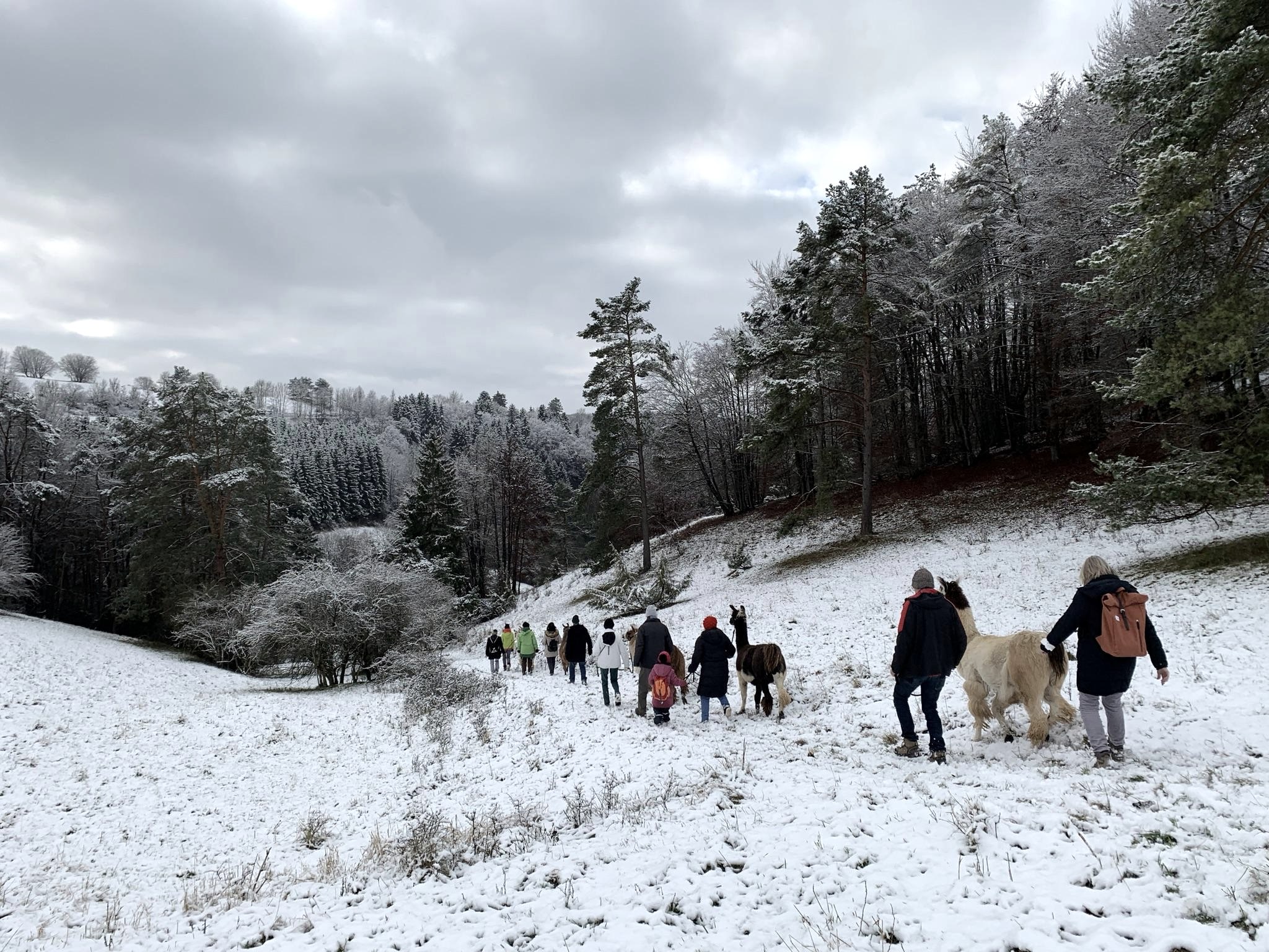 Direct onder de Schönecker Burgberg leven onze wollige lama's, die in de winter zeker beter voorbereid zijn op een wandeling dan wij mensen. Hier begint ook onze bijzondere nieuwjaarstocht: Een winterwandeling met onze lama's, die we op traditionele wijze afsluiten met stokbrood en punch op het lamaweide.