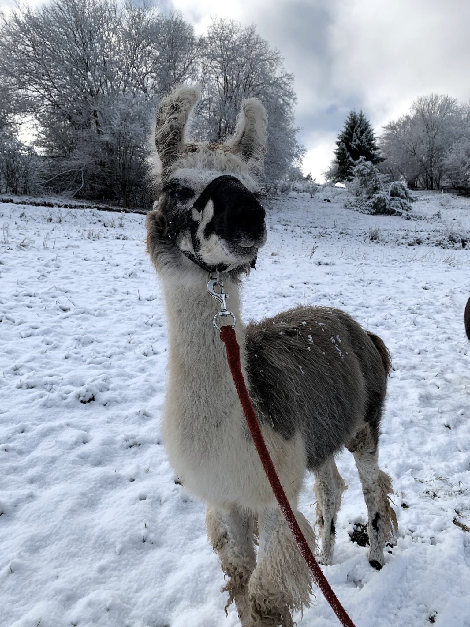 Nadat we onze viervoetige touroverlangers hebben leren kennen, gaat het ook al snel van start. We wandelen door het winterse Eifel-landschap, genieten van de frisse lucht en de rust die onze lama's uitstralen. We kiezen onze route afhankelijk van de weersomstandigheden; deze leidt in ieder geval door het natuurreservaat Schönecker Schweiz.