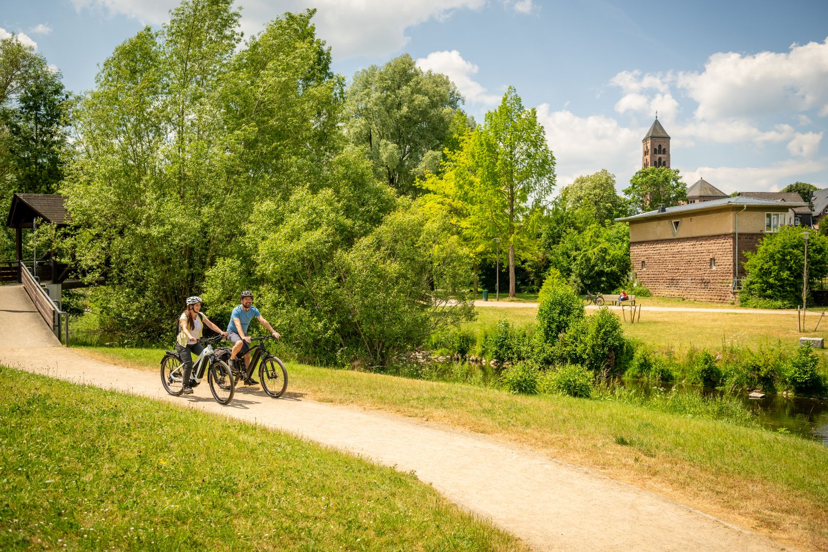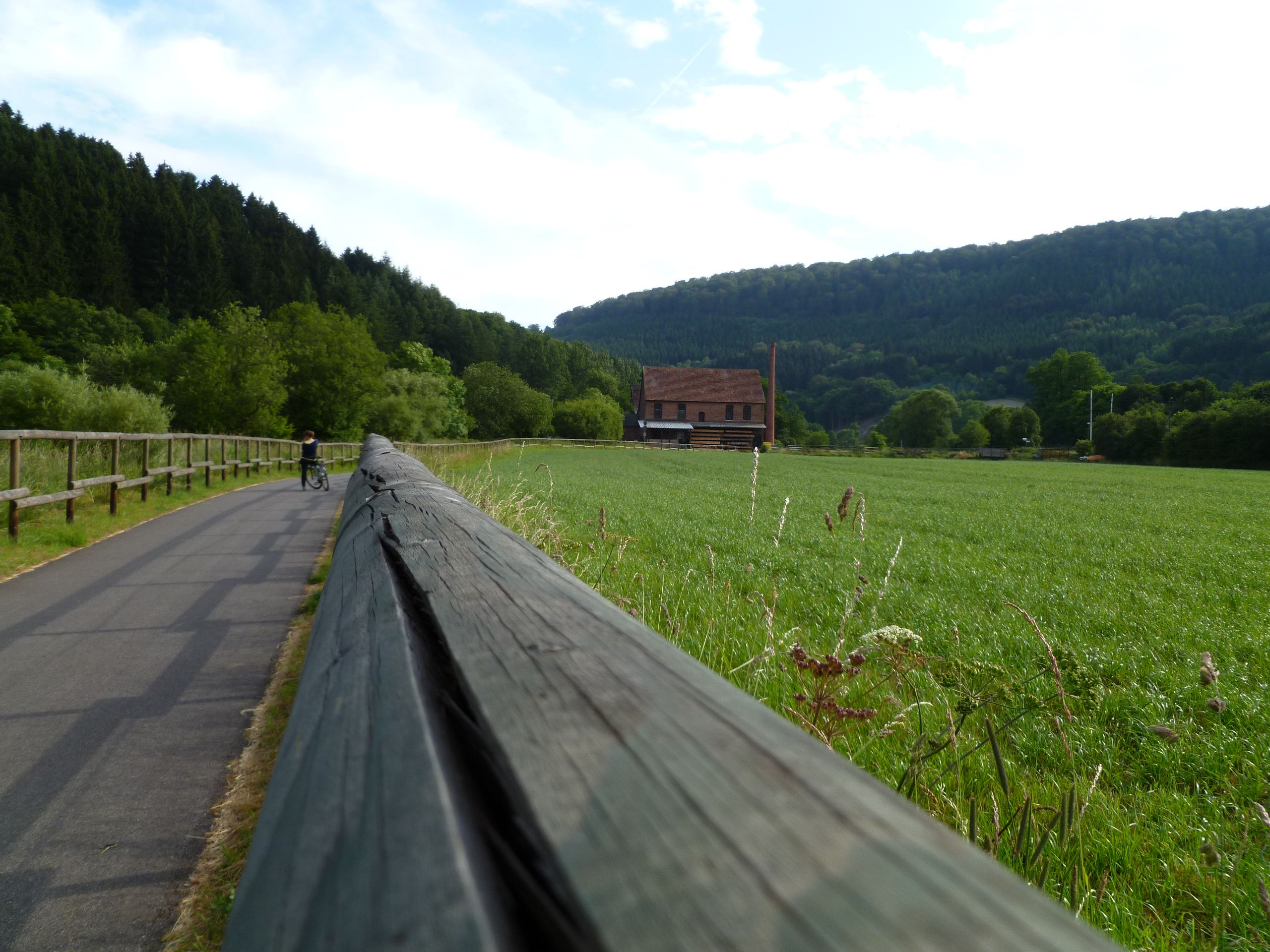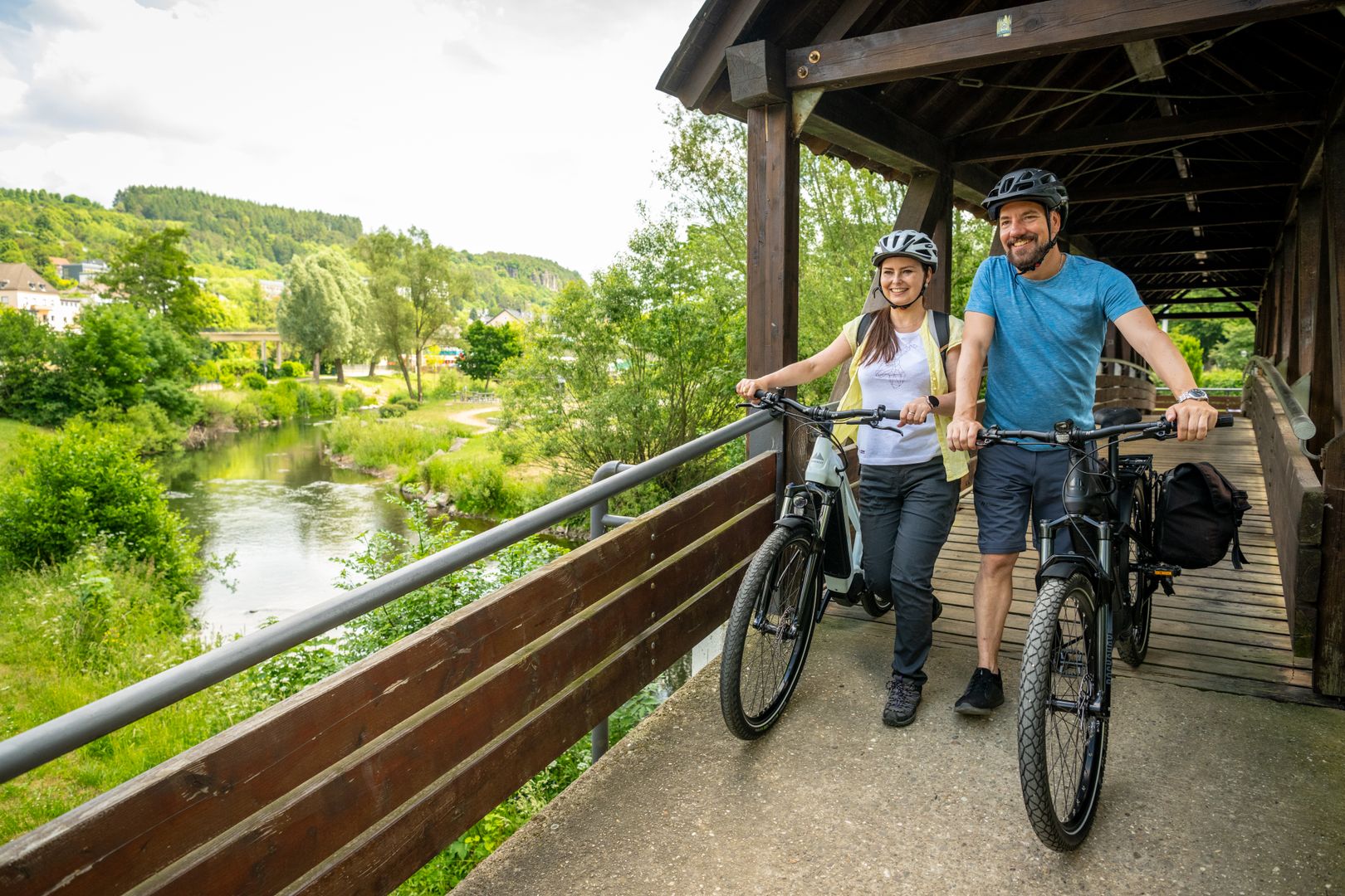 Over de hoge brug gaat het over het Kyll-fietspad in noordelijke richting, langs Dohm-Lammersdorf, een schilderachtig dorpje in de Eifel en een eerste tip voor een tussenstop: bij Müllich’s Hof kun je genieten van Eifelse lekkernijen en zelfgebakken taart.