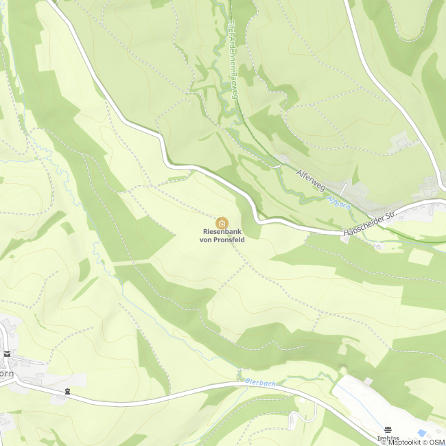 Du erreichst diese XXL-Bank zu Fuß über den Albachhöhenweg, der direkt daran vorbeiführt. Von Pronsfeld auf der L16 kommend Richtung Habscheid befindet sich kurz hinter dem Ort links ein Wirtschaftsweg. Diesem folgst du ca. 200 m bis zur Kreuzung bis du wieder links abbiegst. Von dort ist die Riesenbank nur noch 350 m entfernt.