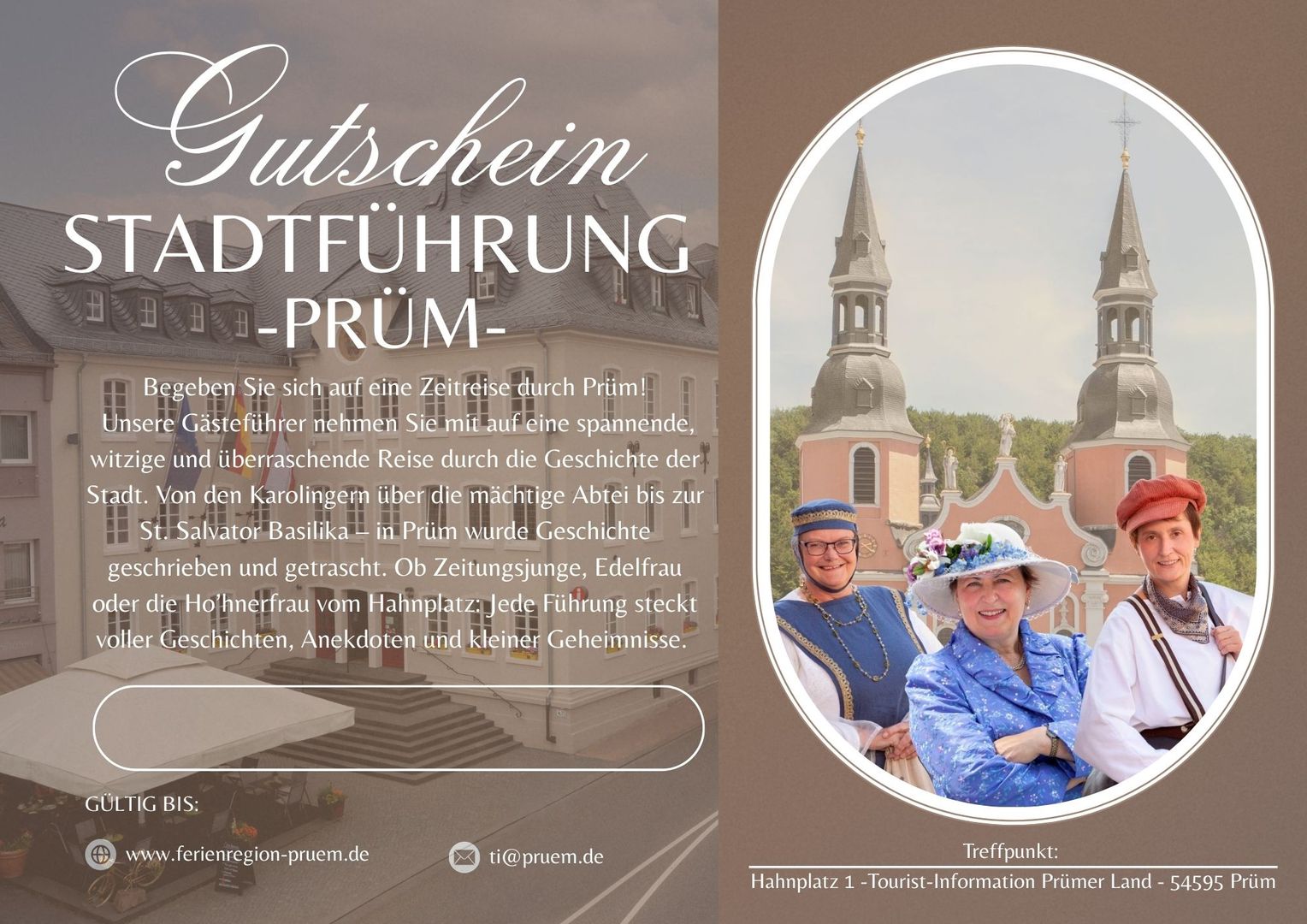 Dauer: Die ca. 3 km lange Tour dauert ungefähr 2 Stunden. Treffpunkt: 54595 Prüm, Hahnplatz 1, Tourist-Information Prümer Land 11.00 Uhr. Anmeldung: Tourist Information Prüm.