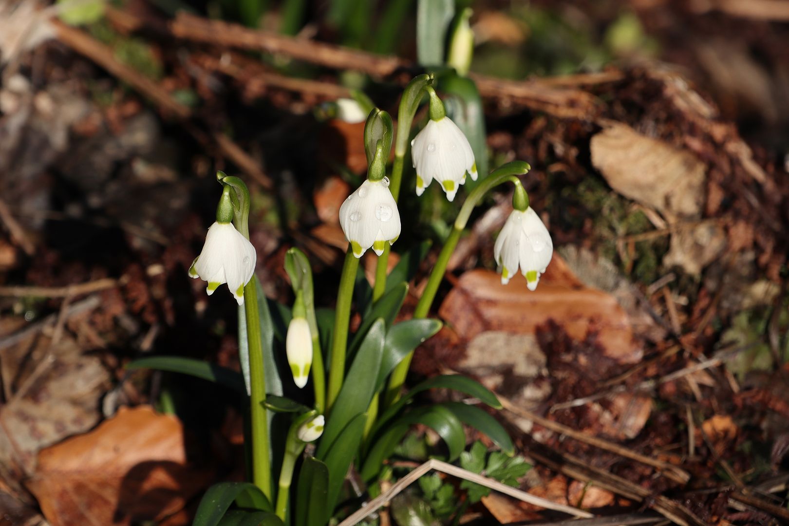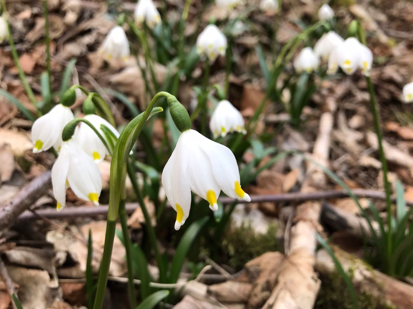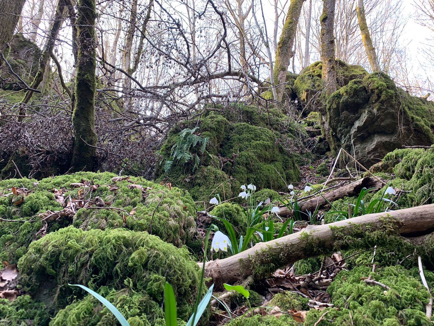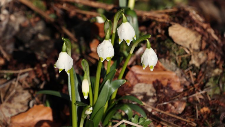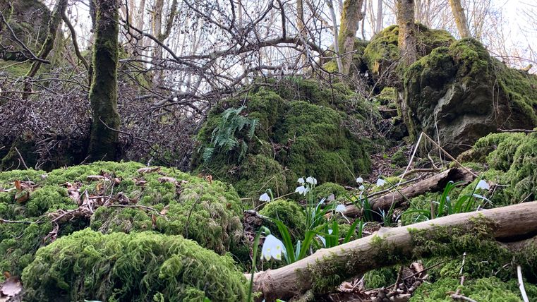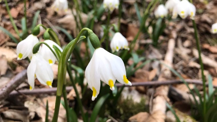 Im Frühjahr ist die Wandertour ein besonderes Erlebnis, wenn sich die ersten Frühlingsboten, die Märzenbecher, zeigen. Sie sehen aus wie große Schneeglöckchen und stehen unter besonderem Naturschutz. Das Vorkommen in der Eifel zählt zu den größten in Deutschland. Es mutet fast an, als hätte es gerade geschneit, wenn der Blick auf die großen Flächen mit den zarten weißen Blüten fällt.