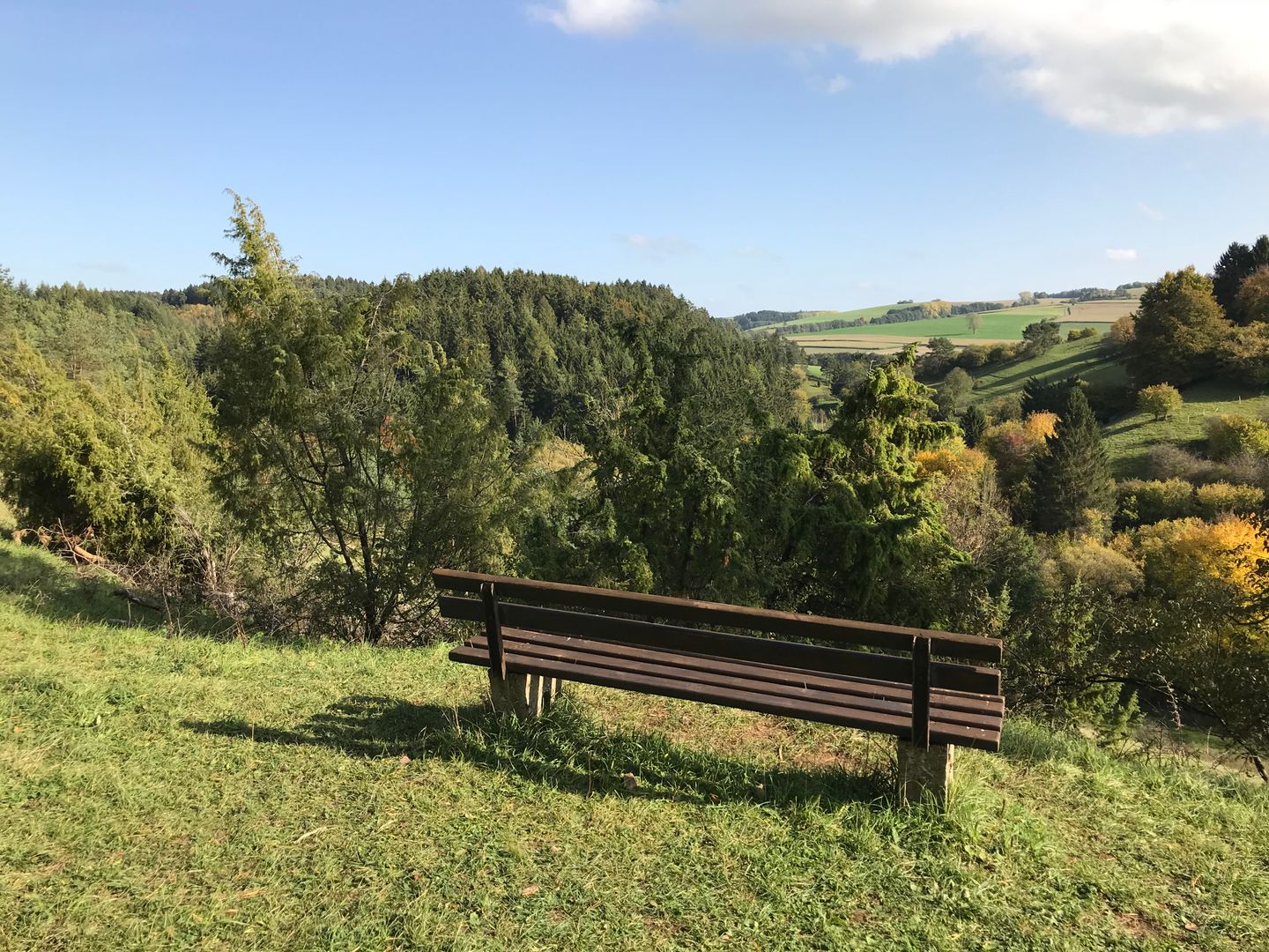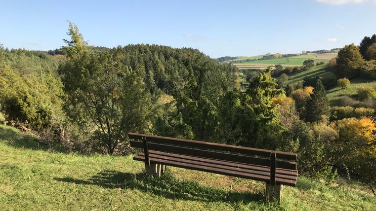 Weiter geht es am Waldrand entlang, bergauf durch Wiesengelände – Auf und Ab wechselt sich bei dieser Wandertour stets ab und nicht nur von den Bergkuppen ist der Blick frei in die weite Eifellandschaft. Nach dem Ichter Berg führt der Wanderweg wieder in den Buchenwald, die Felsen lassen skurrile Formen und Figuren erkennen. Ein kleiner Abstecher hinauf zur Keltenfliehburg darf schon sein, dann geht es weiter auf dem Weg ins Altburger Bachtal hinein. Es folgt ein Serpentinenaufstieg hinauf auf den Berg Auf Icht. Ruhebänke laden zu einer kleinen Pause ein, um die Aussicht zu genießen. Von hier ist der Weg nicht mehr weit ins Schalkenbachtal zum Ausgangspunkt der Wanderung.
