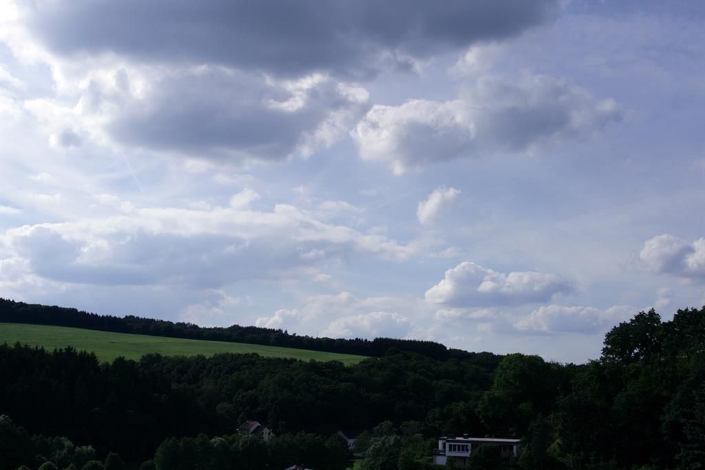 • Ein Himmel mit vielen Wolken über einer grünen Landschaft. Im Hintergrund sind Wälder und einige Gebäude sichtbar.