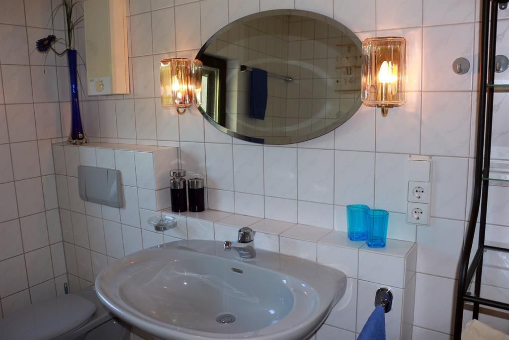 • Ein helles Badezimmer mit einem modernen Waschbecken und einem großen Spiegel. Die Wände sind gefliest, und es gibt verschiedene dekorative Elemente in blau und schwarz.