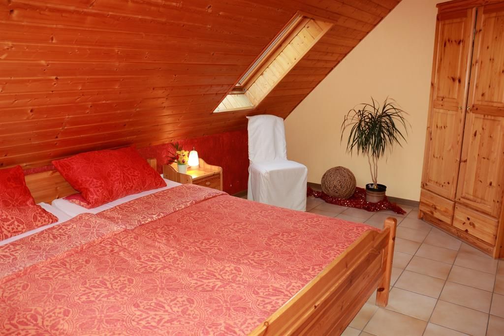 • Ein gemütliches Schlafzimmer mit einem Holzdecke und roten Kissen. Im Raum stehen eine Pflanze und ein Kleiderschrank.