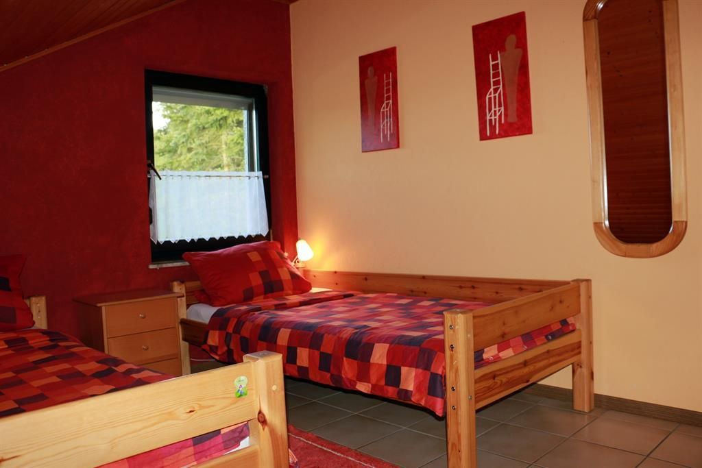 • Ein gemütliches Schlafzimmer mit zwei Einzelbetten und bunten Bettwäsche in Rot und Blau. Die Wände sind in warmen Farben gestrichen und mit einfachen Dekorationen versehen.