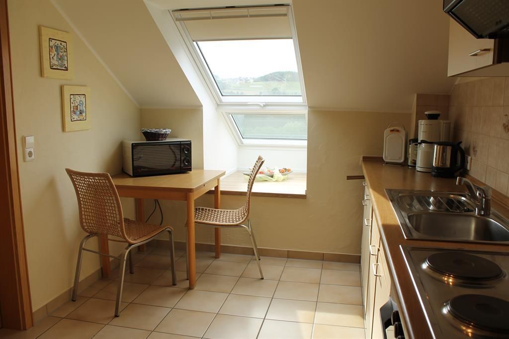 • Eine einfache Küche mit einem Tisch und zwei Stühlen. Ein Fenster lässt viel Tageslicht herein und bietet eine schöne Aussicht.