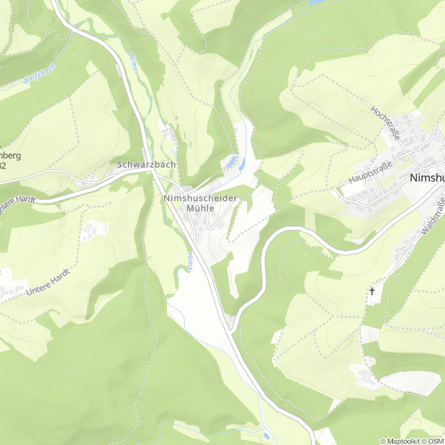 • Eine ruhige Landschaft mit sanften Hügeln und einem klaren Himmel. Im Vordergrund sind einige Wohnhäuser und viel grüne Natur zu sehen.