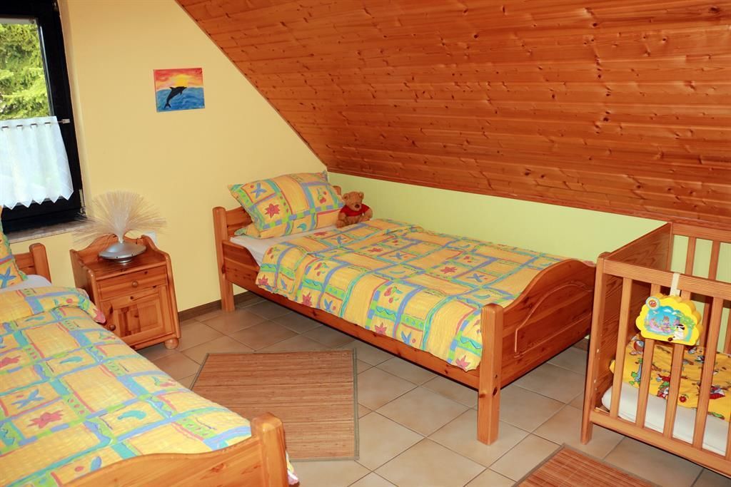• Ein gemütliches Kinderzimmer mit zwei Betten und einem Kinderbett. Die Wände sind in sanften Farben gestrichen und die Bettwäsche hat ein buntes, fröhliches Muster.