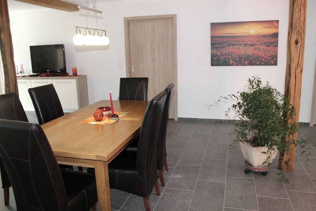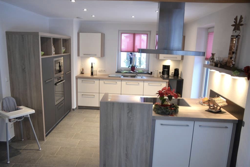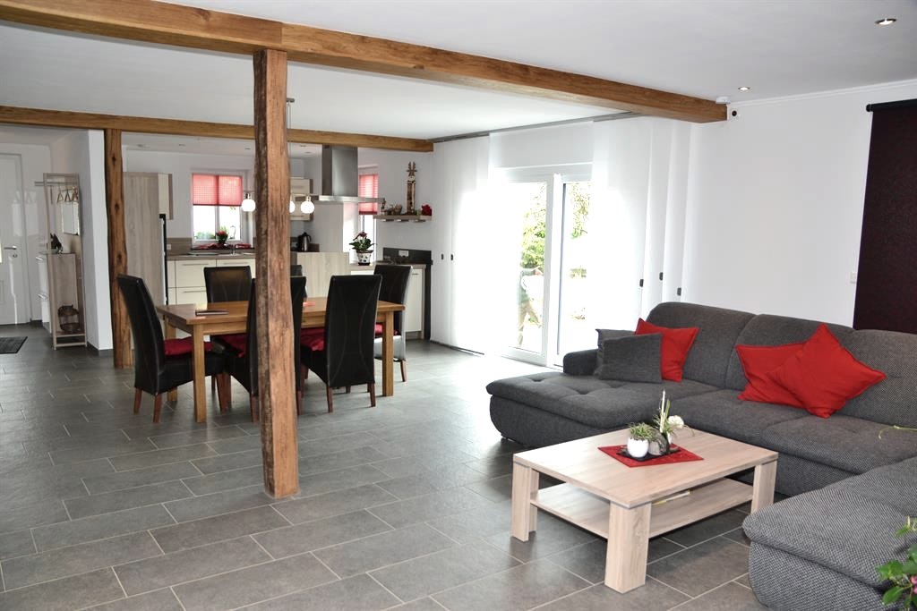 Wir bieten Ihnen auf 100 qm Wohnraum eine Wohlfühlatmosphäre, die einzigartig ist. Die neue Ferienwohnung „Eifelgold“ besticht durch erstklassige, moderne Gestaltung mit Liebe zum Detail. Vom grauen Schieferboden, selbstverständlich mit Fußbodenheizung ausgestattet, bis zu den beiden schönen Schlafzimmern und dem luxeriösen Badezimmer (Regendusche, Fön), bleibt kein Wunsch offen.