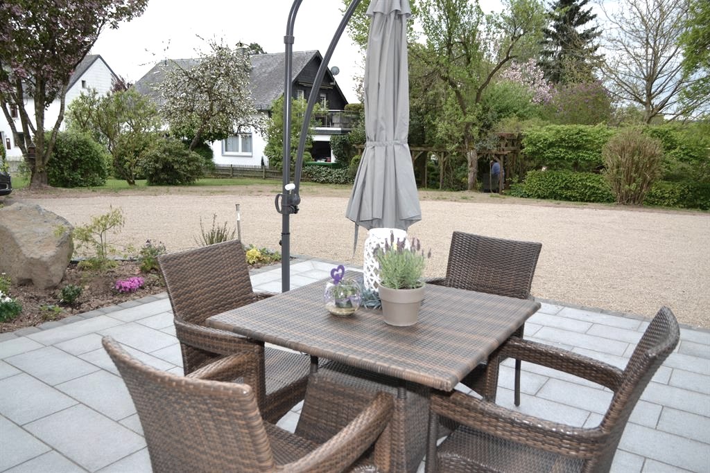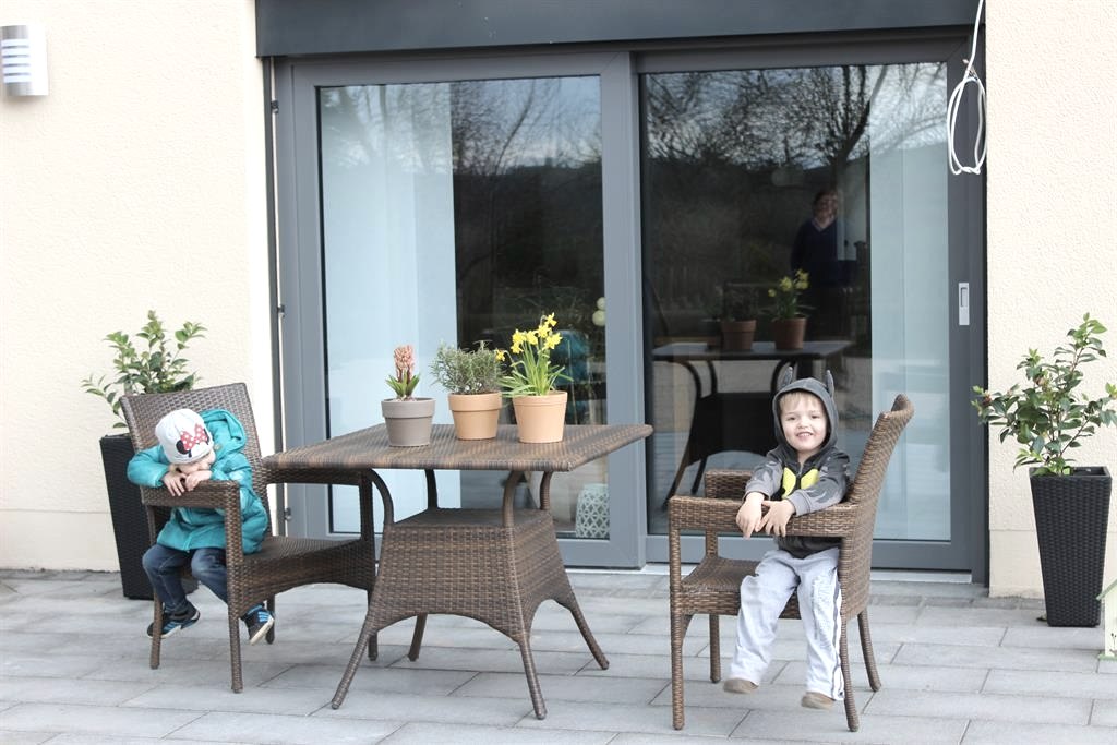 Die Wohnung ist umgeben von Wiesen und Wäldern. Im Aussenbereich befindet sich eine 25 qm große Terrasse mit angrenzendem Gartenbereich und einer Obstwiese mit viel Platz für Spaß und Spiel der Kinder.