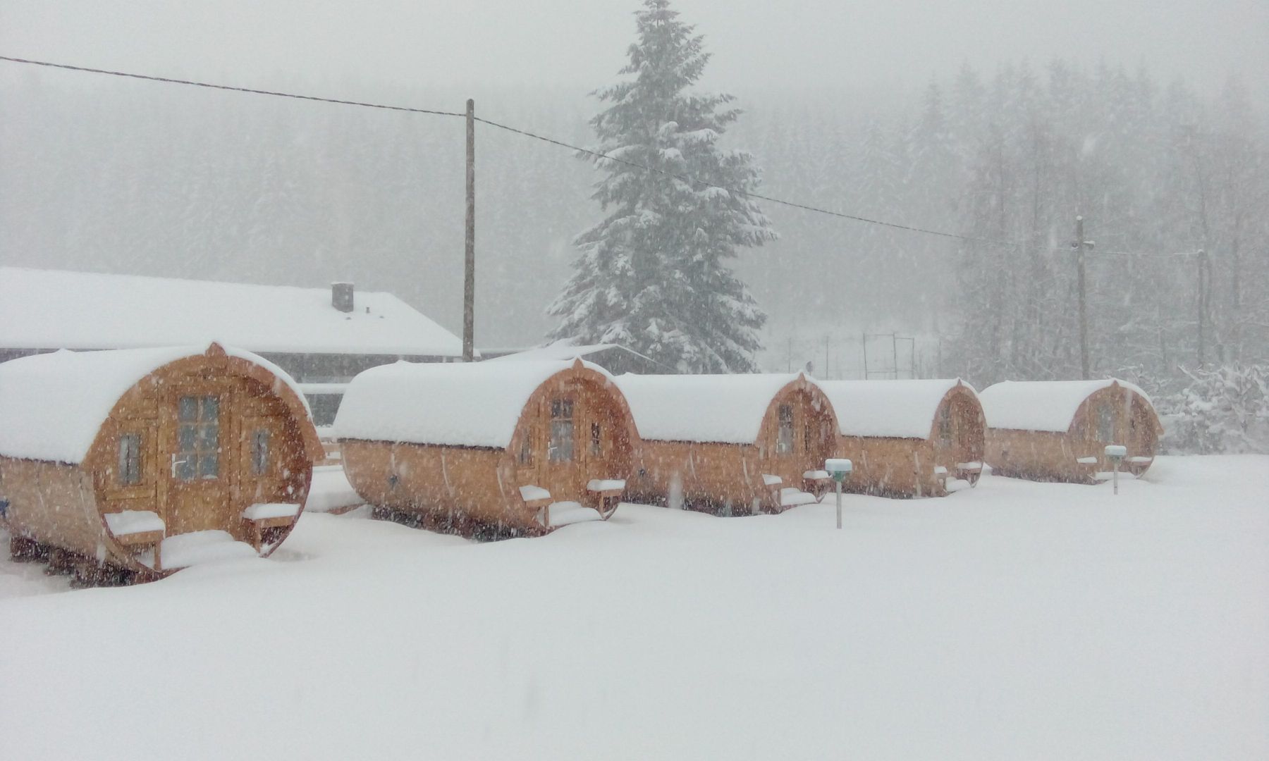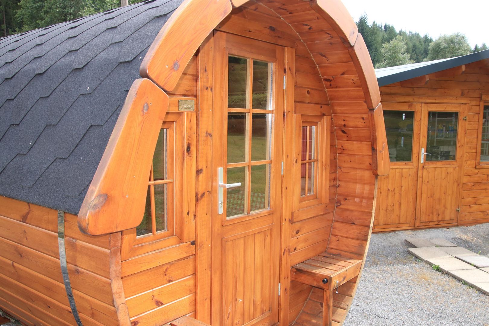 • Ein hölzernes, rundes Häuschen mit einem großen Fenster und einer Eingangstür. Im Hintergrund sind weitere ähnliche Gebäude zu sehen.