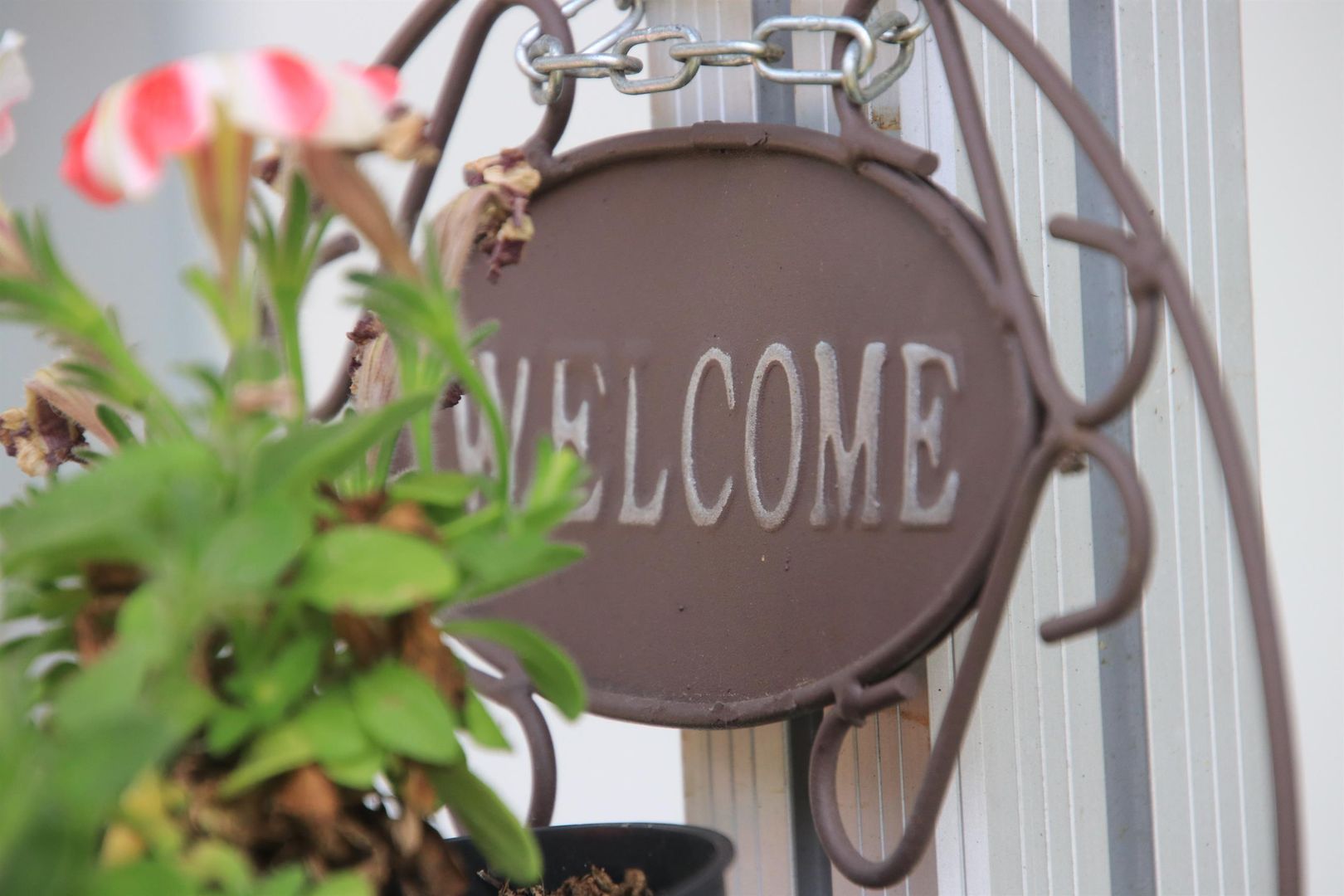 • Ein Willkommensschild aus Metall hängt an einem Haken. Im Vordergrund sind Blumen zu sehen.