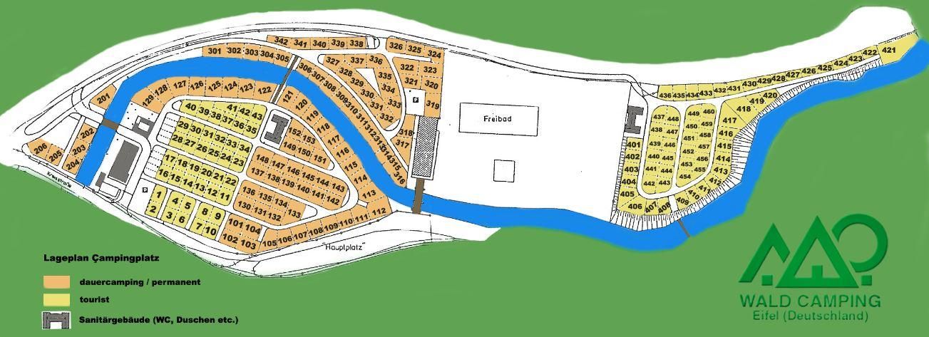 • Eine Karte eines Campingplatzes mit verschiedenen Stellplätzen, einem Fluss und umliegenden Bäumen. Die verschiedenen Bereiche sind farblich gekennzeichnet.